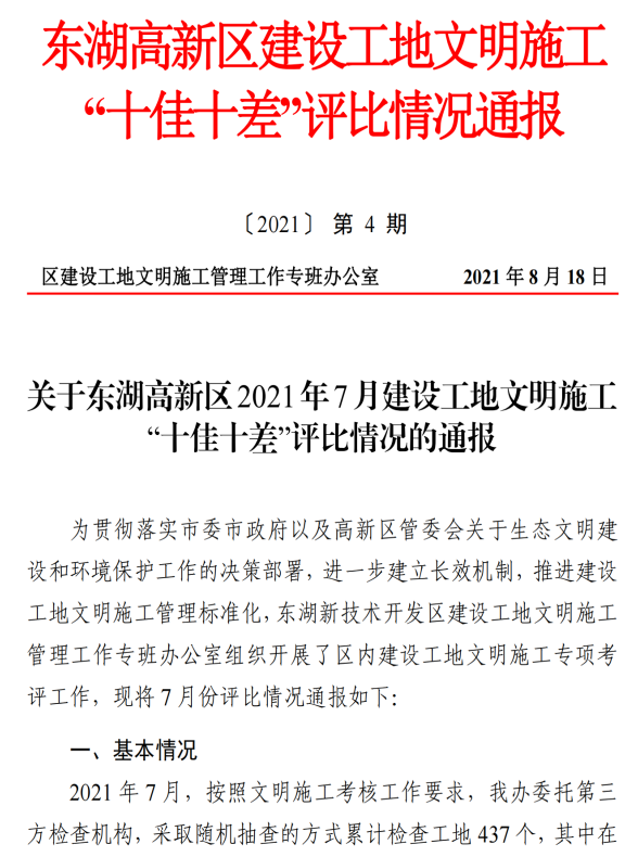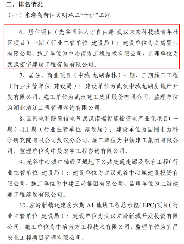 ? 根據東湖新技術開發區建設工地文明施工管理工作專班辦公室組織開展的區內建設工地文明施工專項考評,之寓未來(武漢未來科技城青年社區)項目被評為2021年7月東湖高新區文明施工“十佳”工地。