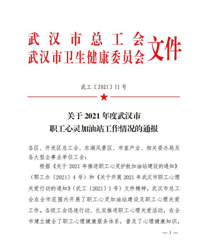 近日,武漢市總工會和武漢市衛生健康委員會聯合發文通報了2021年度武漢市職工心靈加油站工作情況,產業園公司榮獲“2021年度武漢市職工心靈加油站”稱號!
